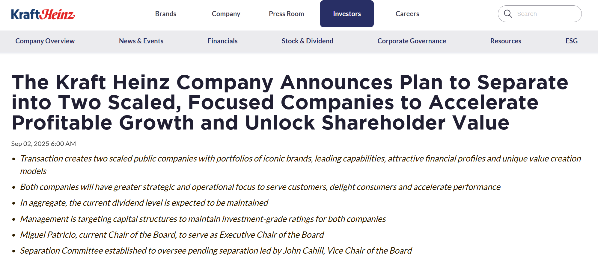 根据公告,拆分后的公司名尚未确定,其中一家“环球风味提升公司”将涵盖现有的调味料和即时餐食业务,包含亨氏调味料、卡夫芝士通心粉等品牌。这部分业务在2024年的销售额接近154亿美元,其中75%来自调味酱、涂抹酱与调味料销售。