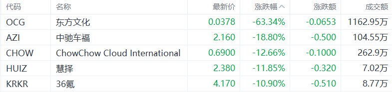 美股异动丨东方文化跌63.34%,为跌幅最大的中概股