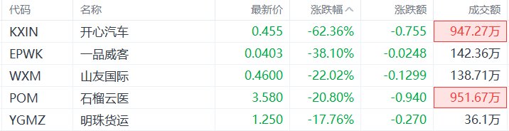 美股异动丨开心汽车跌62.36%,为跌幅最大的中概股