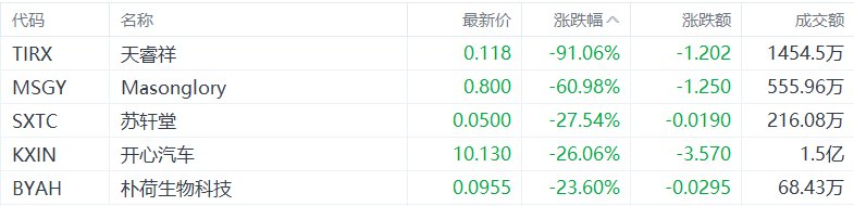 美股异动丨天睿祥跌91.06%,为跌幅最大的中概股