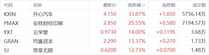 美股异动丨开心汽车涨33.87%,为涨幅最大的中概股