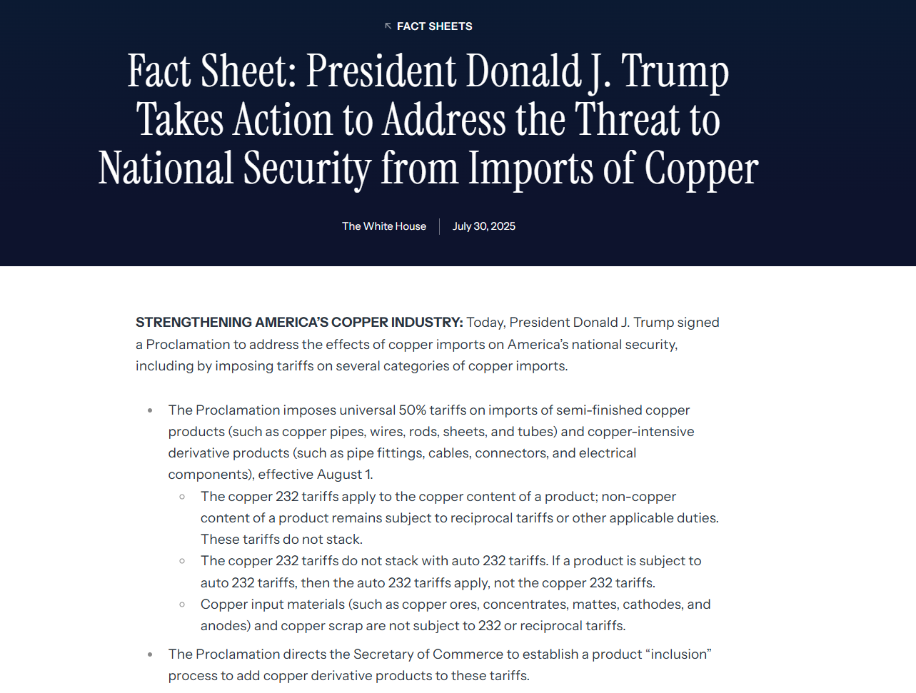 具体而言,根据白宫发布的公告,美国将自8月1日起对进口半成品铜产品(例如铜管、铜线、铜棒、铜板和铜管)及铜密集型衍生产品(例如管件、电缆、连接器和电气元件)普遍征收50%的关税。