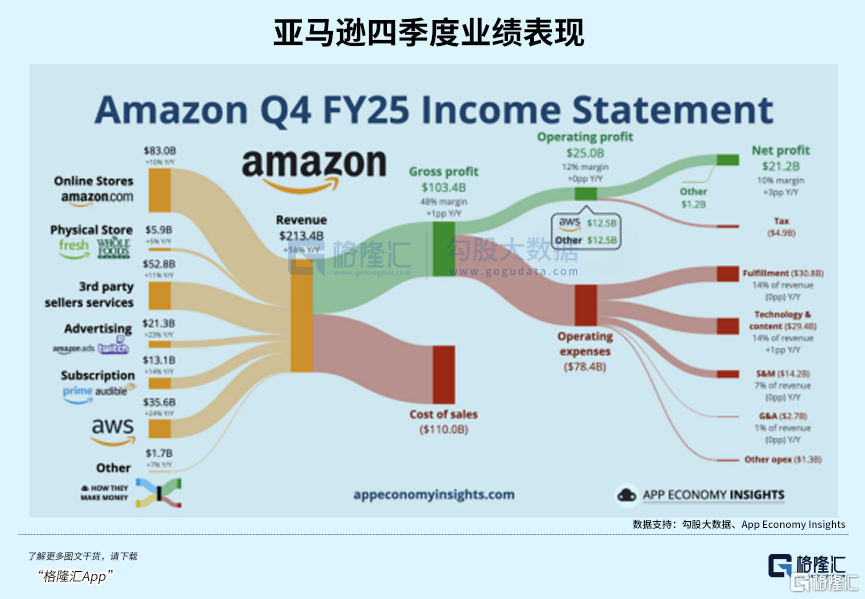再看昨晚公布业绩的亚马逊,四季度收入和净利润也没有任何问题,AWS云业务增长保持稳定(24%),2026年资本支出计划高达2000亿美元,盘后也遭到了10个点猛砸。