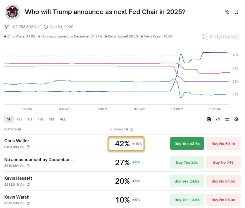 在线博彩市场Polymarket和Kalshi周四的数据显示,美联储理事沃勒和两位“凯文”——凯文·哈塞特和凯文·沃什是目前最有可能接替鲍威尔的人选。同时,据知情人士周四透露,沃勒可能正“后来居上”,成为特朗普顾问团队中接替鲍威尔担任美联储主席的热门人选。