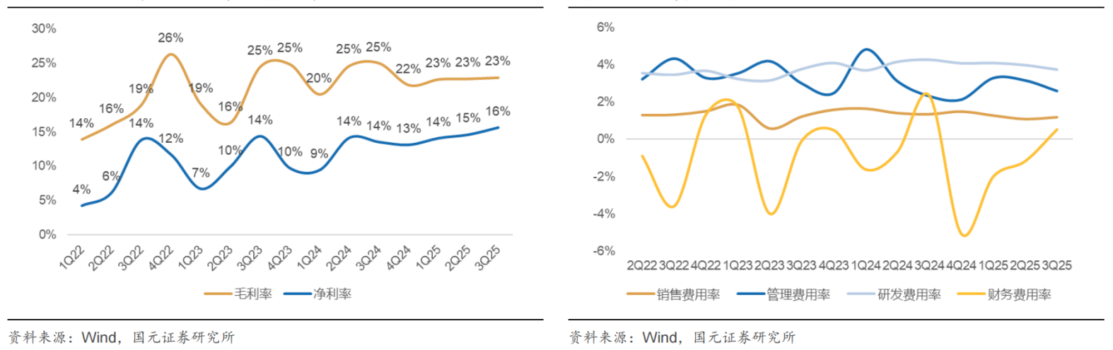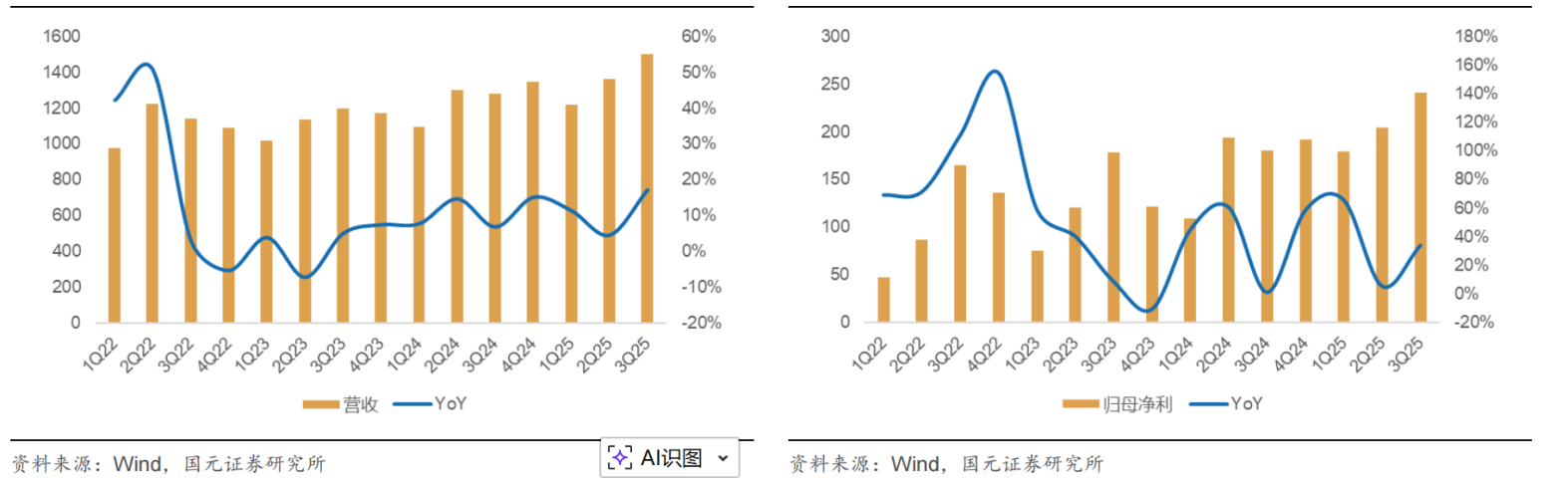 10月28日,公司发布2025年三季报。2025年前三季度,公司营收实现40.78亿元,YoY+10.96%;归母净利实现6.25亿元,YoY+29.46%;毛利率和净利率分别为22.79%和14.85%。单季度25Q3来看,公司营收实现14.99亿元,YoY+17.16%,QoQ+10.13%;归母净利实现2.41亿元,YoY+33.77%,QoQ+17.98%;毛利率和净利率分别为22.92%和15.66%。