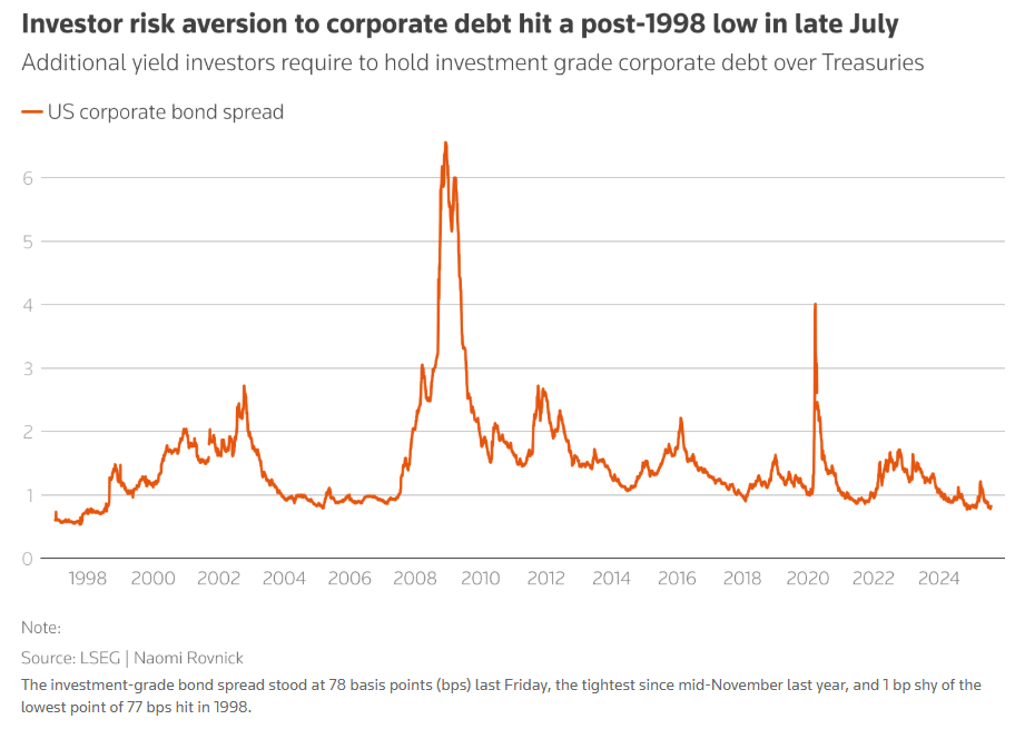 所谓的信贷市场(也被称作企业信用市场),以公司债券为市场主体,涵盖公司债券在内的各类债务证券和贷款。市场研究数据显示,衡量公司债相对于政府发行债需支付的利差——信用市场的主要估值指标——在7月29日降至仅比1998年的历史低点高1个基点。
