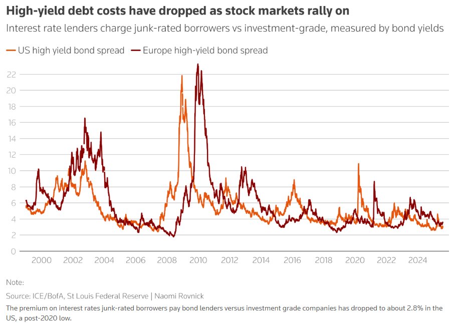 美国垃圾级借款人相对于投资级公司向债券出借人支付的收益率溢价已降至仅仅约2.8%,创下2020年之后的新低,这一数据说明高收益债(信用最弱的那批债券)现在给投资者们的风险补偿非常薄,一旦全球经济增长预期再度答复走弱或违约率抬头,市场回归常态可能将出现“跳涨式走阔”,截至高收益率债券价格可能集体大幅下跌。
