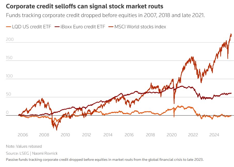 在2018年的中美贸易战导致的全球市场低迷、2022年美联储激进加息引发市场暴跌以及2023年末的类似规模市场震荡之前,跟踪高评级公司信用资产的热门交易型基金(即ETF)在全球股市迈入下行轨迹之前一段时间就已下跌。