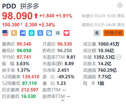 美股异动丨拼多多盘前续涨超2% 今日将发布财报