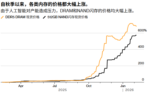 过去几个月,动态随机存取存储器(DRAM)现货价格飙升逾600%,尽管智能手机和汽车等终端产品需求依然疲软。更有甚者,人工智能还催生了对NAND芯片和其他存储产品的新需求,也推高了这些领域的成本。