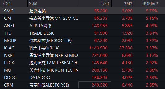 科技股整体走强,超微电脑、安森美半导体涨超5%。