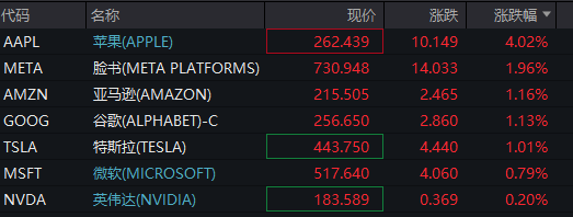 个股方面,美股科技七巨头中,苹果涨超4%,脸书、亚马逊、特斯拉、谷歌涨超1%。