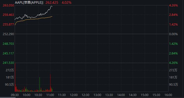 苹果股价盘中一度涨至263.05美元,创历史新高。