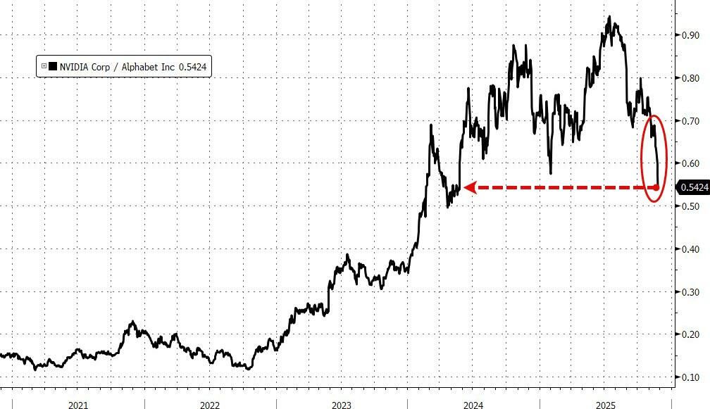 本周二早盘,英伟达股价一度重挫逾7%,市值蒸发近3500亿美元,后跌幅收窄,收跌2.6%,收创两个多月新低,而谷歌母公司Alphabet股价则进一步走高,早盘曾涨超3%,尽管此后回吐部分涨幅,仍收涨1.6%,连续第三个交易日创收盘历史新高。