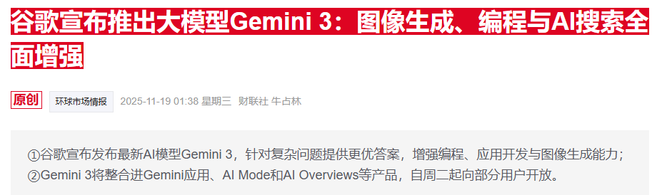 野村证券策略师Charlie McElligott也将Gemini 3的影响比作 DeepSeek冲击。他在给客户的报告中写道,Alphabet的最新模型已经“重置了AI领域的棋盘格局”,并把市场带入了一个“新的DeepSeek时刻”。