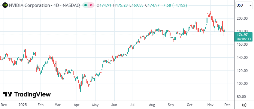 财联社11月26日讯(编辑 赵昊)周二(11月25日)美股早盘,英伟达股价大幅走低,日内一度跌超7%报169.55美元,较上月录得的历史高位回落了逾20%。