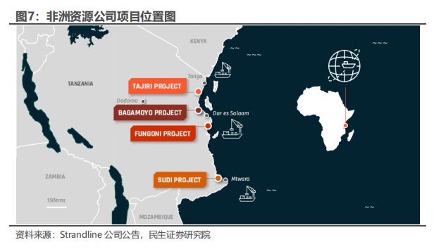 公司收购的非洲资源公司在坦桑尼亚持有Fungoni、Tajiri、Sudi、Bagamoyo等四个重砂矿项目84%权益(其他16%为坦桑尼亚政府持有且不可稀释),其中Fungoni、Tajiri项目已获得采矿证,Sudi、Bagamoyo项目仍在勘探阶段。