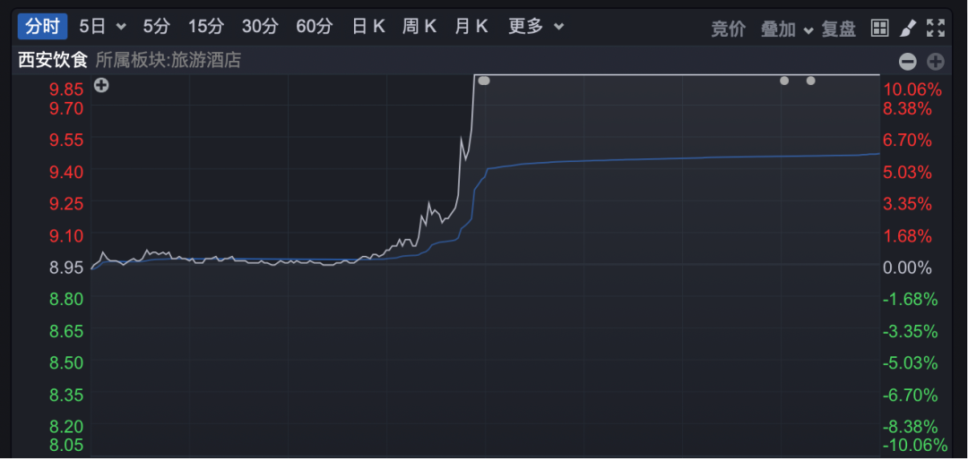 旅游概念股今日集体走强,板块指数一度放量直线拉升,创年内新高。酒店餐饮指数盘中也放量快速上涨,一度涨逾4%。西安饮食垂直涨停,西安旅游、全聚德、同庆楼等涨幅居前。
