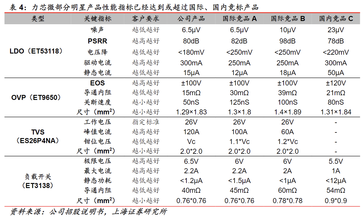 公司产品端、客户端优势突出,并持续拓展新兴应用领域。产品端,公司专注电源管理芯片研发二十年,部分明星产品如LDO、OVP、TVS性能指标已达到或超过国际、国内竞标产品,且凭借产品的极低失效率在客户端树立了良好的口碑;同时,公司积极推广智能组网延时管理单元、信号链等产品。