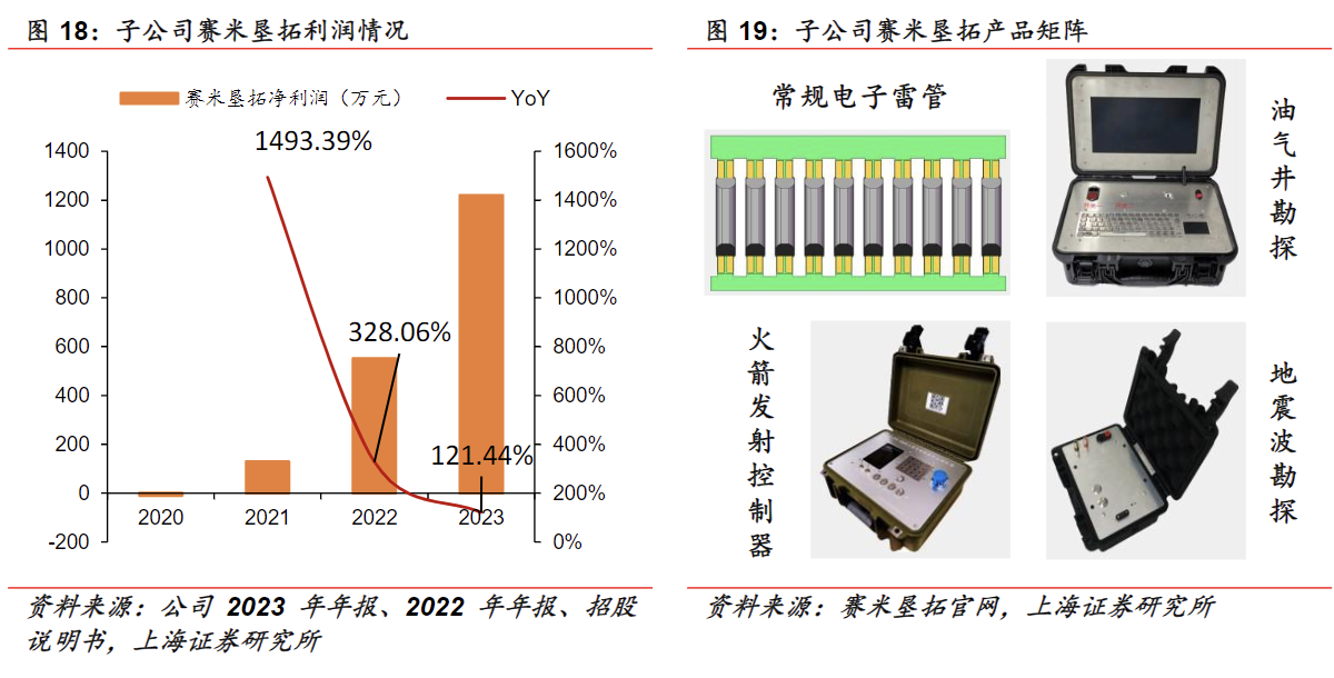 子公司赛米垦拓国内海外多点开花,赛米垦拓推出多种型号的民爆数码电子雷管电子延期芯片与模块、起爆控制系统、生产线配套设备、检测设备以及新一代人工影响天气火箭用控制芯片及系统设备、地震波勘探用电子模组及设备、油气井勘探用芯片模组及控制设备。赛米垦拓目前已完成包括黑龙江伊春鹿鸣钼矿、河北承德峪耳崖金矿等在内的多个国内工程项目,同时成功开拓海外市场,产品远销南美洲、非洲、澳洲、南亚等地。