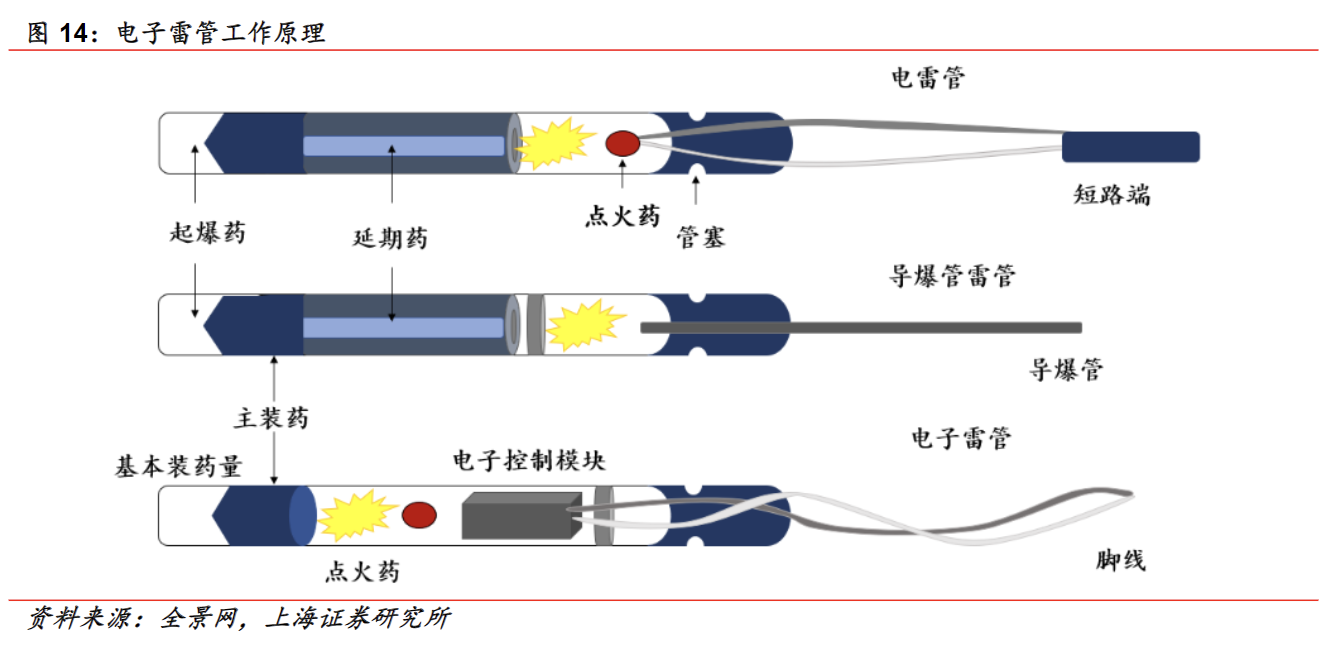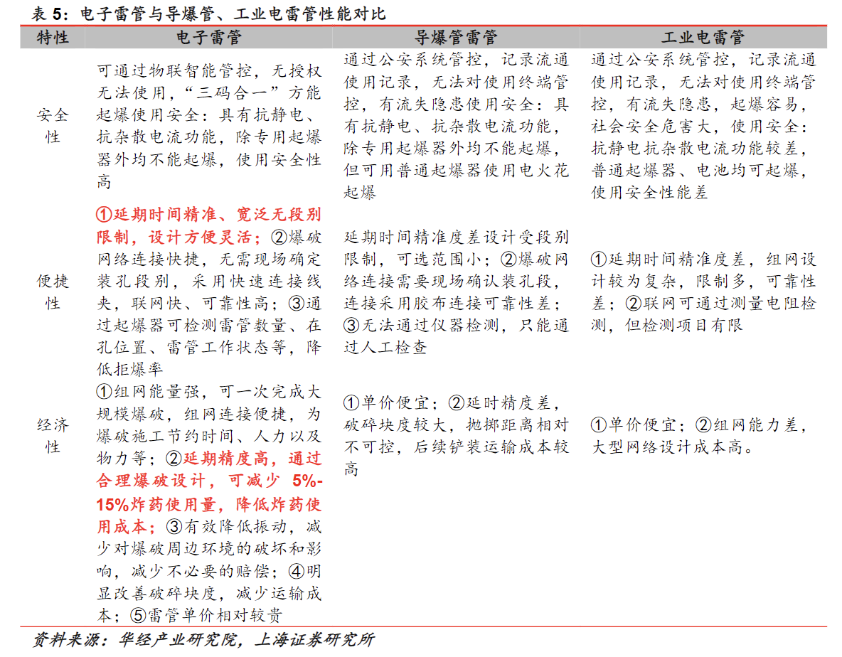 政策催化下,公司电子雷管业务迎来发展良机。电子雷管在安全性、使用便捷性、使用经济性方面均有明显优势。相较于其他雷管,电子雷管不仅因为具有延期精度高、可任意设置延期时间,使得起爆过程安全,同时每发雷管中的芯片都存储了各自的特定密码,只有在专用起爆器上输入该密码,数码电子雷管才能被起爆,可有效防止因数码雷管或起爆器丢失、被盗等引起的社会安全问题。此外在经济性方面,电子雷管还可以减少约5%-15%的炸药,节约成本。
