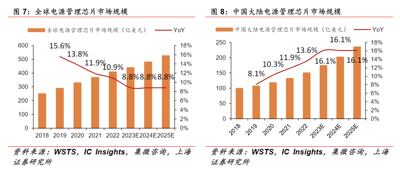 中国大陆电源管理芯片市场规模增速高于全球。据集微咨询数据显示,2022年全球电源管理芯片行业市场规模约为408亿美元,同比增长10.9%,预计2025年行业规模将增长至526亿美元,2022-2025年均复合增速为8.8%;2022年中国大陆电源管理芯片行业市场规模约为150亿美元,同比增长11.9%,预计2025年行业规模将增长至235亿美元,2022-2025年均复合增速为16.1%。