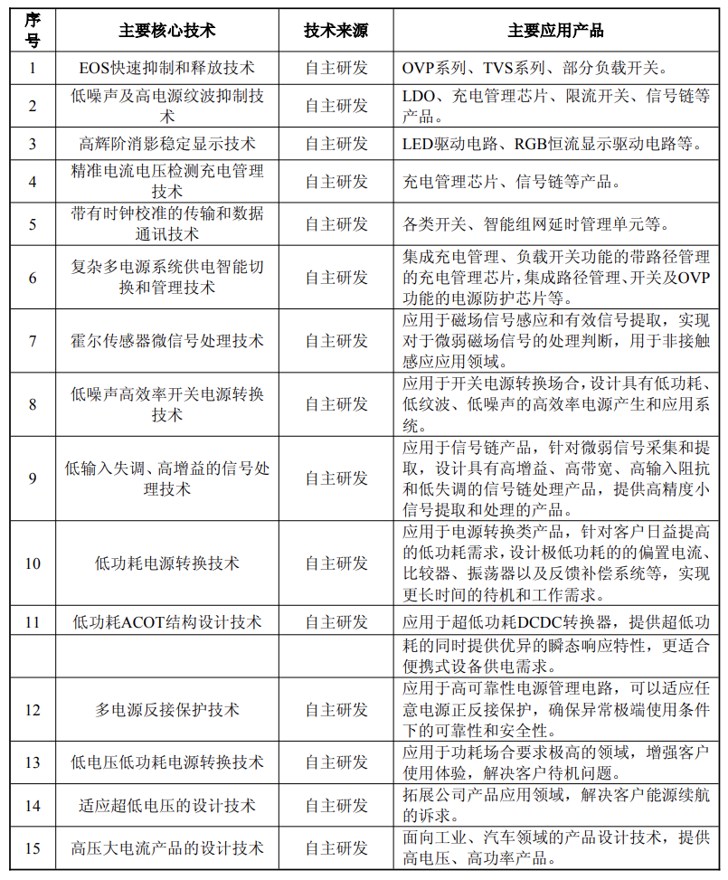 公司深耕电源管理芯片领域二十余年,结合市场需求和前沿信息持续创新,围绕电源管理芯片低噪声、高效能、微型化及集成化等发展趋势形成了丰富的核心技术和功能模块IP,并以此为基础形成了覆盖电源转换、电源防护、信号链等多类别设计平台。