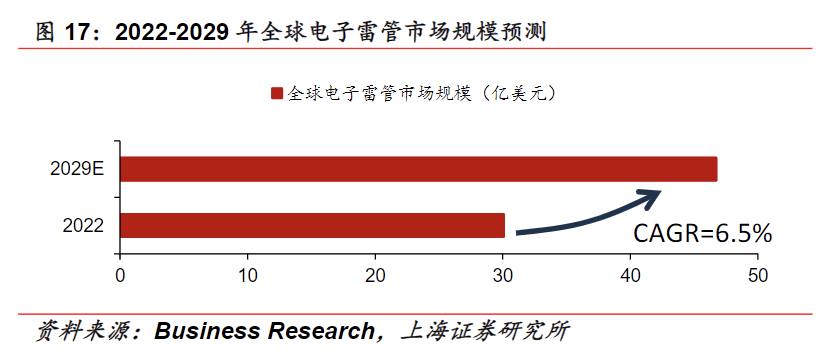 政策大力推动电子雷管置换进程,电子雷管已实现全面替代。工信部发布《“十四五”民用爆炸物品行业安全发展规划》,要求除保留少量产能用于出口或其它经许可的特殊用途外,2022年6月底前停止生产,8月底前停止销售除工业数码电子雷管外的其它工业雷管。2022年10月,工信部发布《工业和信息化部安全生产司关于进一步做好数码电子雷管推广应用工作的通知》,表示暂时保留地震勘探电雷管产能,2023年6月底前停止生产、8月底前停止销售;暂时保留煤矿许用工业电雷管生产和销售,2022年9月底前停止生产、11月底前停止销售。根据中爆协数据,2023年国内电子雷管产量为6.70亿发,同比增长94.79%,渗透率为92.54%,而2021年渗透率仅为18%。据BusinessResearch报道,2022年全球电子雷管市场规模为30.07亿美元,预计到2029年将达到46.73亿美元,2022-2029年复合增长率约为6.5%。