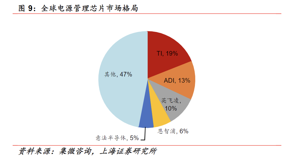 竞争格局方面,国外企业占据电源管理芯片市场全球80%以上份额,以德州仪器(TI)、亚德诺(ADI)、英飞凌(Infineon)等为代表的国外企业在产品线完整性及整体技术水平上保持领先优势,但由于电源管理芯片种类众多,头部厂商也较难取得垄断优势,整体竞争格局较为分散。伴随国产厂商不断扩充产品型号、提升产品性能,我们认为电源管理芯片国产替代进程有望加速。