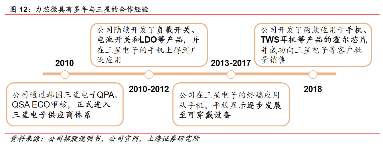 公司在消费电子领域深度绑定大客户三星,供应链地位稳固,产品竞争力优势明显。公司2010年进入三星电子供应商体系,此后公司陆续开发了负载开关、电池开关和LDO等产品,并在三星电子的手机上得到广泛应用。