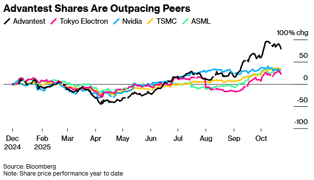 作为2025年全球表现最佳半导体股票之一,爱德万测试同时也是估值最高的股票之一。但部分投资者认为,鉴于其在全球芯片测试仪市场58%的份额,其主导地位值得溢价投资。