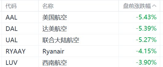 美伊冲突扰乱出行,美股航空股盘前集体下跌,其中,美国航空、达美航空、联合大陆航空跌超5%,Ryanair跌超4%,西南航空跌近4%。