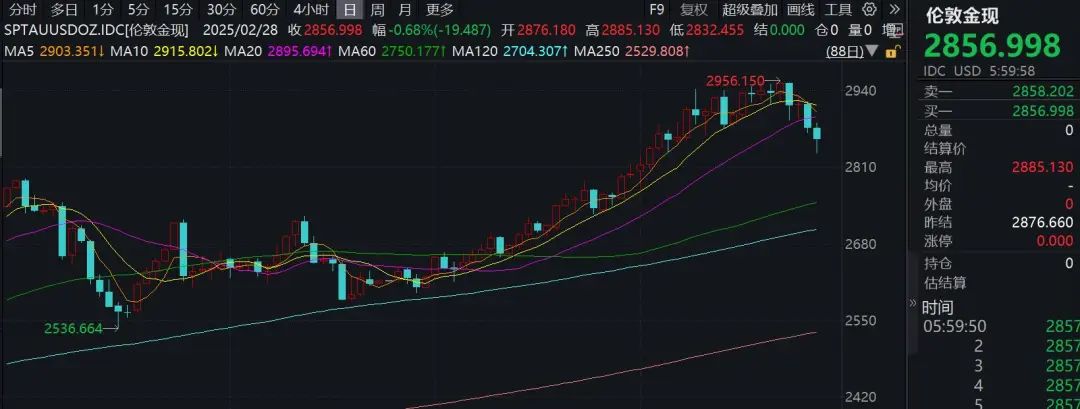 2月28日夜间,COMEX黄金价格一度跌至2832.5美元/盎司,较2月24日盘中创下的历史高点2974美元/盎司,已跌超4%。28日COMEX黄金期货收跌0.99%,报2867.3美元/盎司,本周累计下跌2.79%。