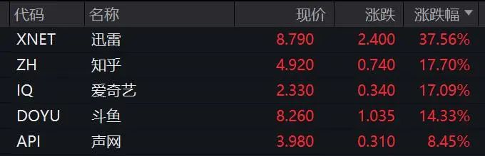 热门中概股多数上涨,纳斯达克中国金龙指数收涨0.12%。迅雷涨超37%,知乎、爱奇艺涨超17%,金山云涨逾5%,微博涨超3%。