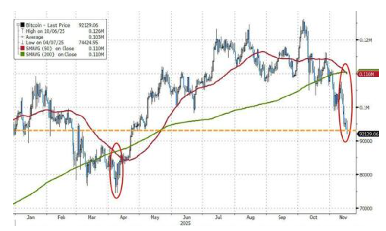 比特币价格周一大幅下挫,跌破92000美元关口,不仅抹去了2025年的全部涨幅,其50日移动平均线也下穿200日移动平均线,形成“死亡交叉”的技术形态。值得注意的是,比特币在4月份触发死亡交叉时,也创下了阶段新低。