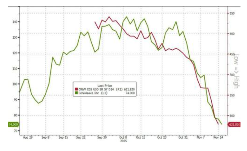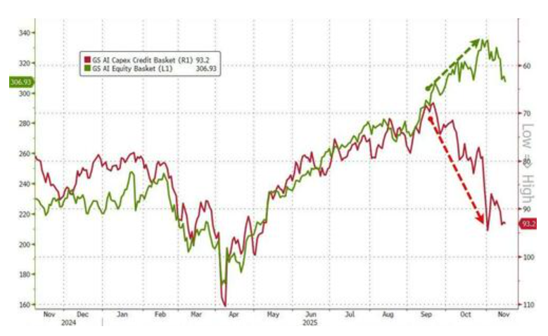 对AI相关企业的信用担忧正在蔓延。包括甲骨文和云服务商CoreWeave在内的“超大规模计算公司”(Hyperscalers)的信用违约互换(CDS)利差持续走阔。