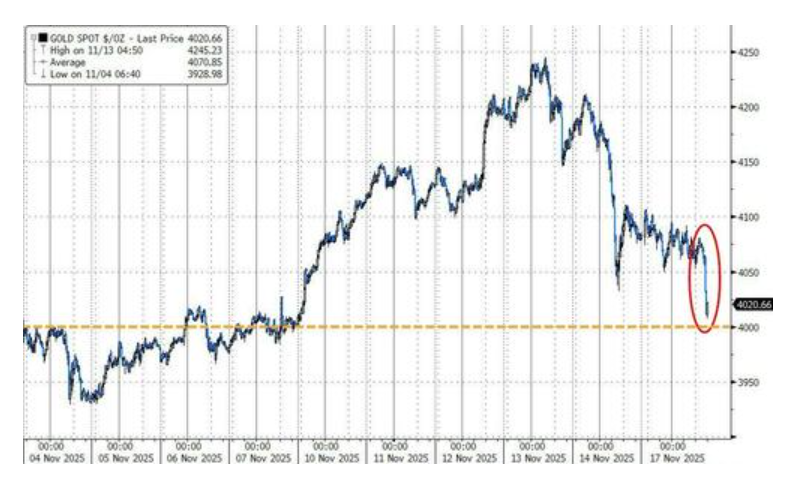这场抛售并不仅限于股票市场。被一些分析师视为投机资产的黄金期货价格回落至每金衡盎司4068.30美元。现货黄金价格跌至4000美元水平附近。