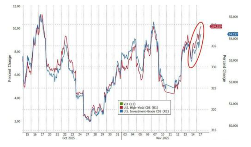 股市的疲软与信贷市场日益显现的压力遥相呼应。数据显示,投资级和高收益公司债的信用利差正在加速扩大,其扩大幅度甚至超过了VIX指数。这表明,投资者对企业违约风险的担忧正在加剧。