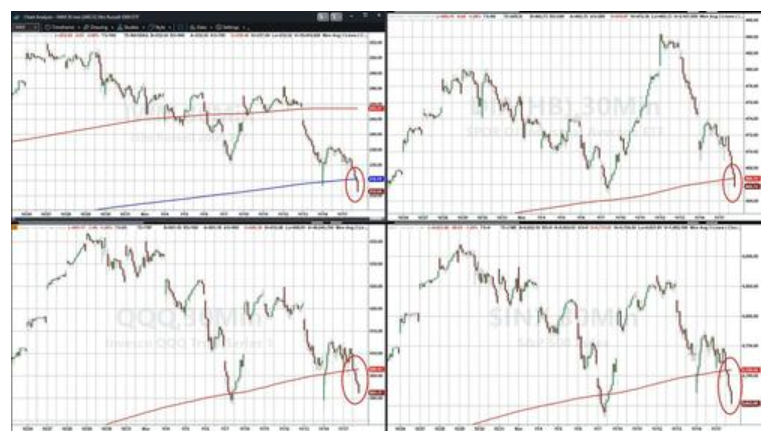 几乎所有主要股指都跌破了关键技术支撑位:标普500指数、道琼斯指数和纳斯达克指数跌破50日均线,RTY指数跌破100日均线。技术分析师通常将跌破此类关键均线视为市场短期趋势可能逆转的信号。