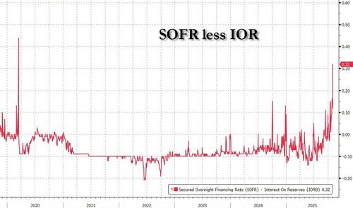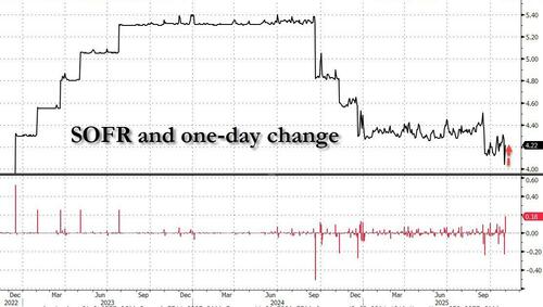更令人担忧的是,担保隔夜融资利率SOFR利率10月31日飙升22个基点至4.22%,远高于美联储3.9%的超额准备金利率,利差扩大至32个基点,创2020年3月以来最高。