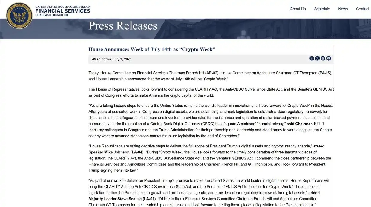早在当地时间7月3日,美国众议院就曾宣布将7月14日当周定为“加密货币周”,届时将审议《数字资产市场透明法案》(Clarity Act)、《反CBDC监控州法案》(Anti-CBDC Surveillance StateAct)以及《指导与建立美国稳定币国家创新法案》(GENIUS Act)等多项法案,为数字资产行业提供其长期以来要求的国家监管框架。