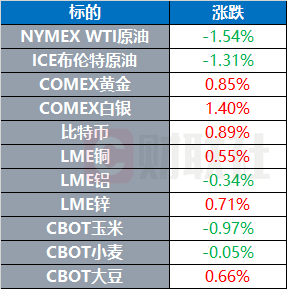 WTI原油期货收跌1.54%,报66.29美元/桶。布伦特原油期货收跌1.31%,报68.76美元/桶。COMEX黄金期货收涨0.85%,报3428.6美元/盎司。COMEX白银期货收涨1.4%,报37.445美元/盎司。