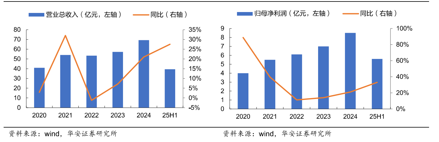 图表2:公司营业总收入及同比增速(2020-2025H1)(左)公司归母净利润及同比增速(2020-2025H1)(右)
