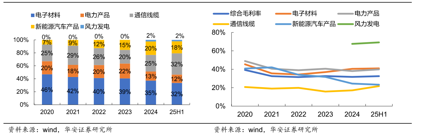 深圳市沃尔核材股份有限公司成立于1998年,于2004年改制为股份有限公司,于2007年登陆深交所完成A股上市。公司自热缩材料业务起家,逐步切入线缆、新能源汽车等领域,业务具体可分为电子材料、通信线缆、电力、新能源汽车及风力发电五类,下游涵盖电器数据中心、航空航天、核电、新能源汽车等诸多领域。2020-2024年,公司业绩稳健增长,营业总收入由41亿元增至69亿元,4年CAGR达14%;公司归母净利润由4亿元增至9亿元,4年CAGR达21%。25H1公司电子材料/通信电缆/新能源汽车产品/电力产品/风力发电业务营收占比分别为32%/32%/18%/12%/6%。