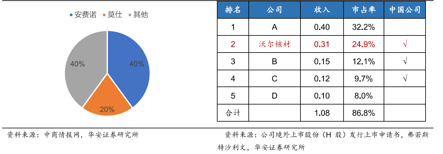 图表4:全球铜缆连接器市场份额占比情况(左)全球高速铜缆市场竞争格局(单位:十亿元人民币)(右)