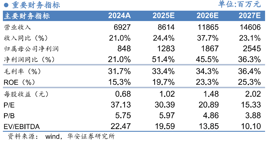 预计公司2025、2026、2027年分别实现营业收入86.1、118.7、146.1亿元;归母净利润分别为12.8、18.7、25.5亿元,对应EPS为1.02、1.48、2.02元,对应2025年9月29日收盘价PE分别为30.39、20.89、15.33倍。首次覆盖给予“买入”评级。