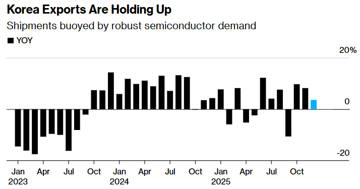 韩国强劲的半导体出口继续掩盖其他行业的疲软,帮助维持了12月前几周的整体出货额增长,韩国目前正在应对美国关税的影响。根据韩国海关周一公布的数据,经工作日差异调整后,12月前20天的出口额同比增长3.6%,上个月同期增速为8.2%。相比之下,11月份全月出口额修正后增幅为13%。未经调整的出口量也增长了