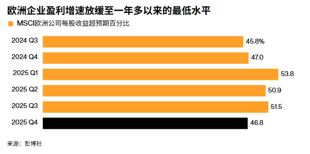 尽管MSCI欧洲指数整体盈利超出市场预期,但其4.7%的同比增速仍低于第三季度的水平,且该基准指数的业绩超预期比例更创下一年多来的新低。当前欧洲企业正面临双重挑战:人工智能加速带来的行业颠覆性冲击,以及中东战争引发的全新地缘风险。