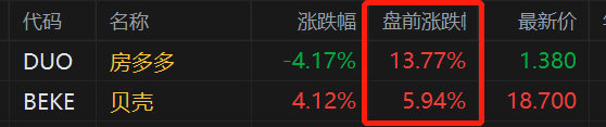 美股异动丨受港股地产股大涨带动,房多多、贝壳盘前分别上涨13.7%及6%