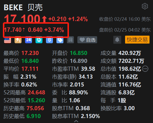 美股异动丨利好叠加,贝壳盘前涨约4%,H股盘中涨超11%